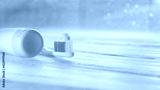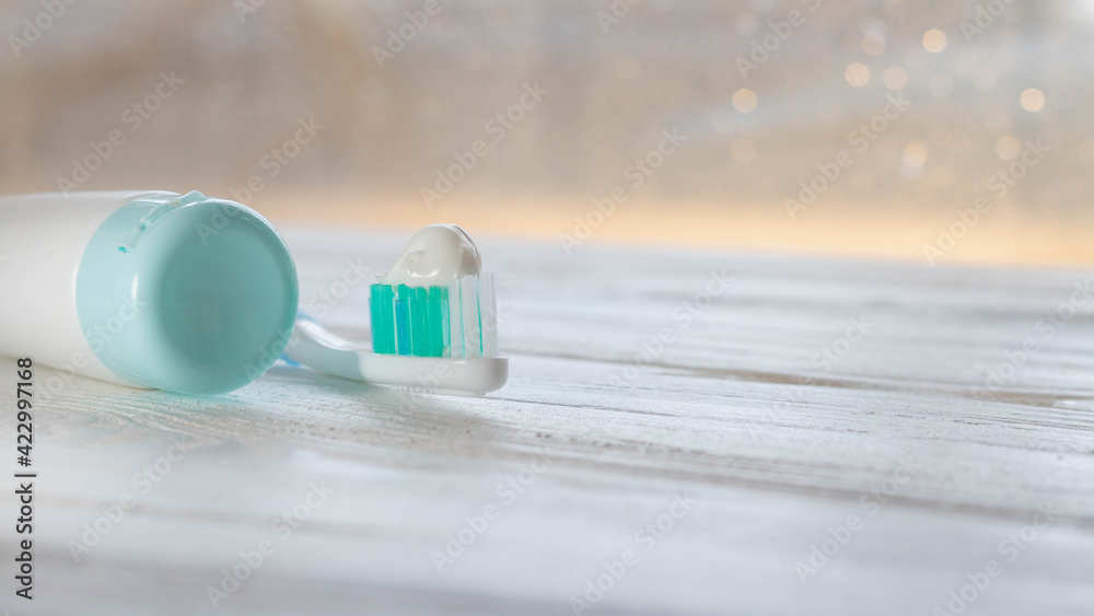 Toothbrushes and toothpaste on a white wooden table. Blue Tooth Cleaning Accessories