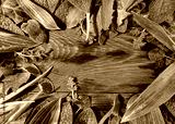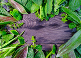 Wooden background with a frame of green leaves of different texture. Spring background of fresh young leaves on a wooden table.