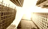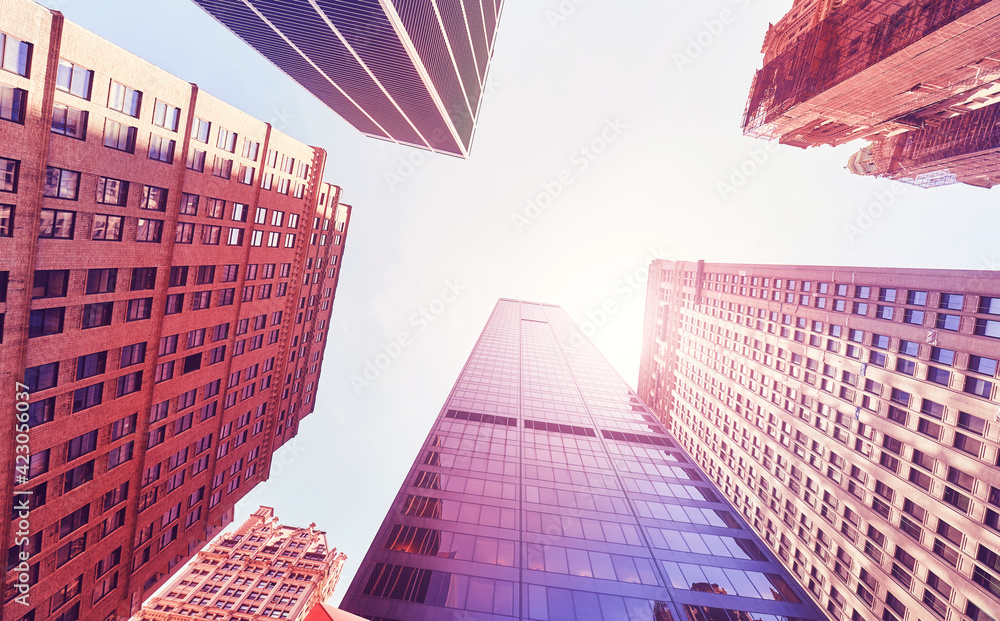 Looking up at Manhattan skyscrapers against the sun, color toned picture, New York City, USA.