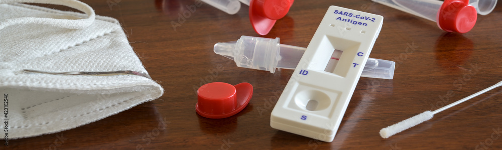 Rapid antigen self test kit for covid-19 with negative result, nasal swabs, tubes, detection device and a surgical ffp-2 face mask on a brown wooden table, panoramic format, selected focus