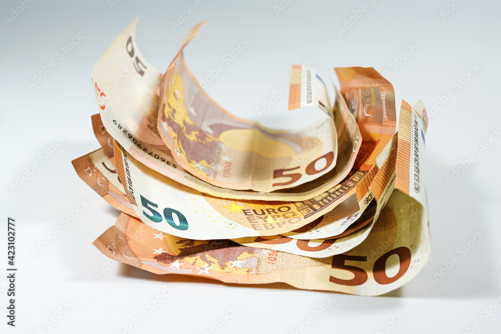 Crumpled 50 euro notes layered on top of each other in a pile, concept for finance and money themes, light gray background, copy space, selected focus