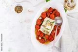 Preparation of ingredients for fetapasta. Trending Feta bake pasta recipe made of cherry tomatoes, feta cheese, garlic and herbs. Top view, above, copy space.