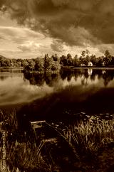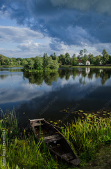 Pond in the summer with dark clouds, boat and reflections, Edole, Latvia