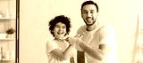 Positive arabian father and son holding toothbrushes and toothpaste, banner