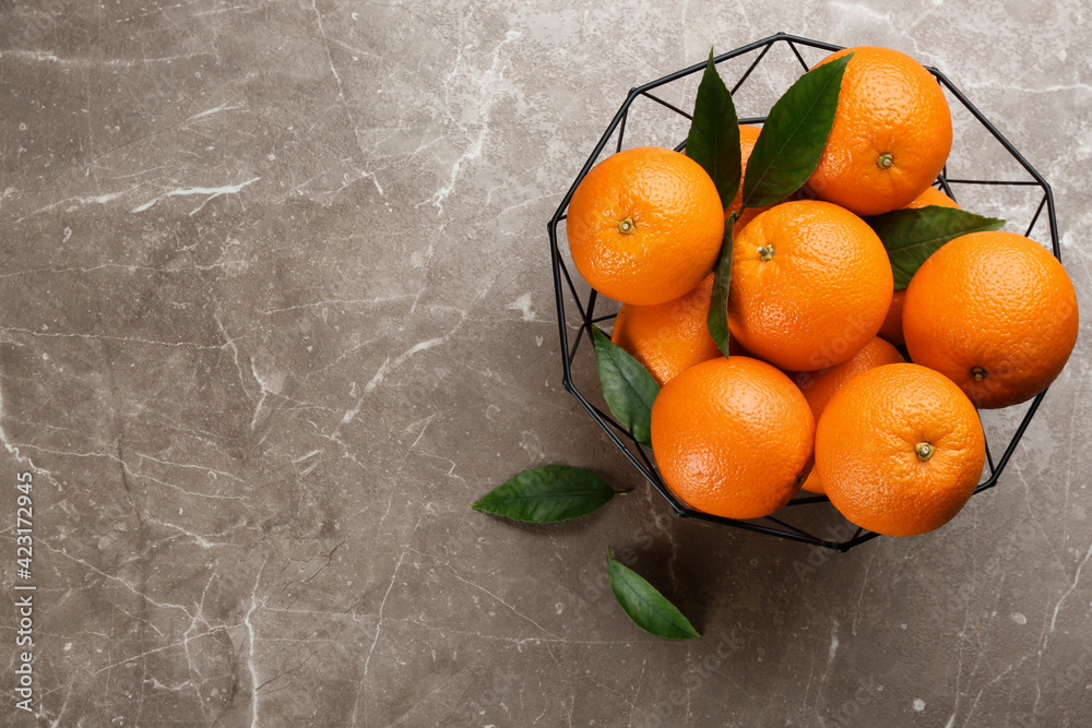 Delicious ripe oranges in fruit bowl on grey marble table, flat lay. Space for text