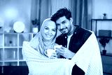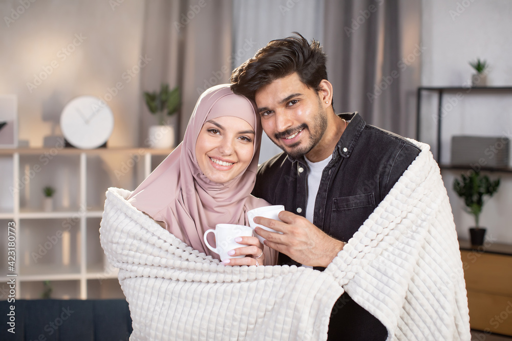 Romantic relationship. Cute Arabian Muslim couple standing together under warm blanket in the living room and drinking coffee together.