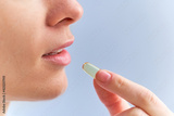 Young woman taking dietary supplement vitamin omega 3 for health. Fish oil softgel, vitamin D and vitamin C for support immunity and disease prevention