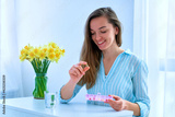 Young smiling attractive happy woman taking dietary supplement vitamin omega 3 for women's health support. Fish oil softgel, vitamin D and C for immunity and disease prevention