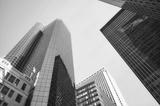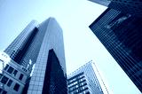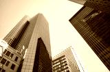 Looking up at Manhattan skyscrapers, color toned picture, New York City, USA.
