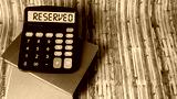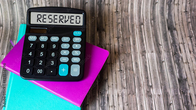 The calculator display says Reserved for. Colored notepads lie on a wooden table