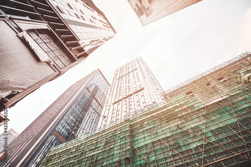 Looking at skyscrapers in downtown Chengdu, color toned picture, China.