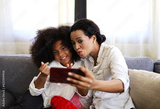 American kid girl smile portrait and selfie photo with mother at home.