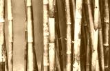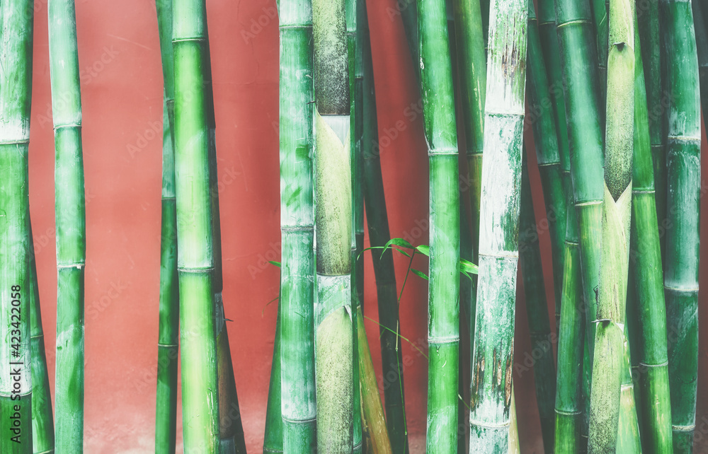 Bamboo stalks against a red wall, oriental background, color toning applied, selective focus.