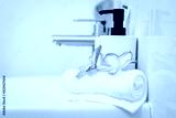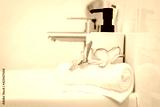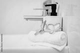 Hand towels and flowers and hand sanitizer in a white bathroom.