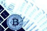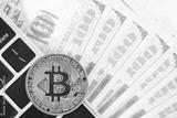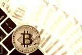 Golden Bitcoins coin and US banknotes with keyboard computer