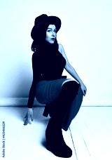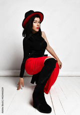Stylish sexy adult woman in modern black sleeveless top, red maxi skirt and wide-brimmed red-black hat sits squatted demonstrating her black high boots. Fashion, stylish casual look for lady concept