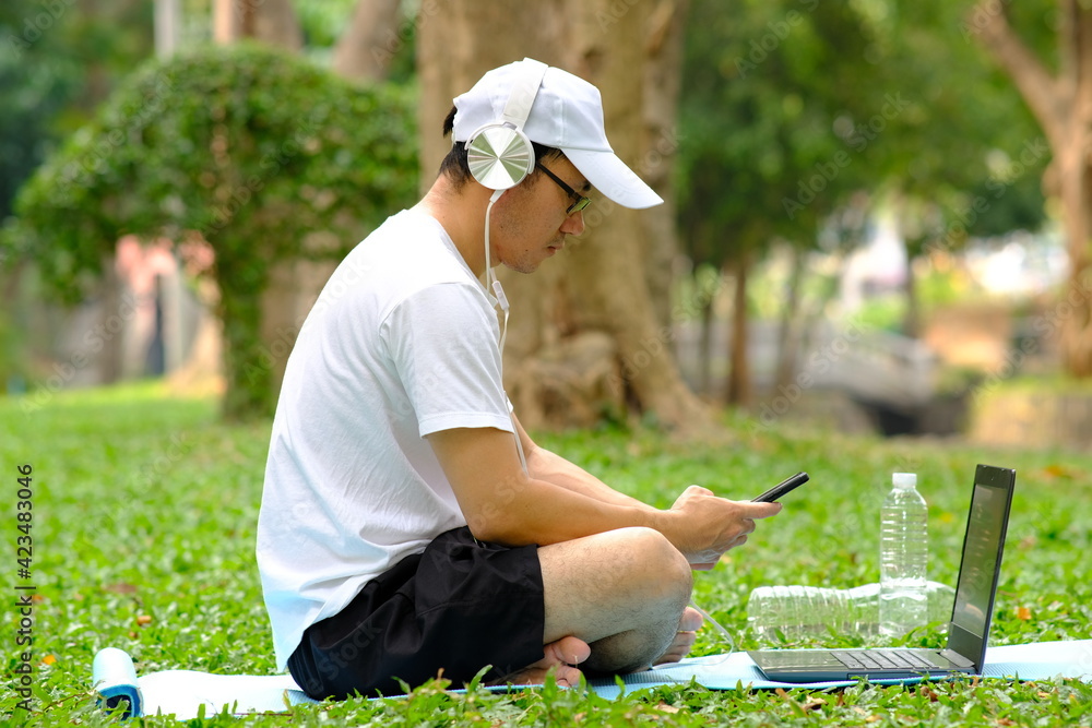 Young man listening music with headphones in the garden