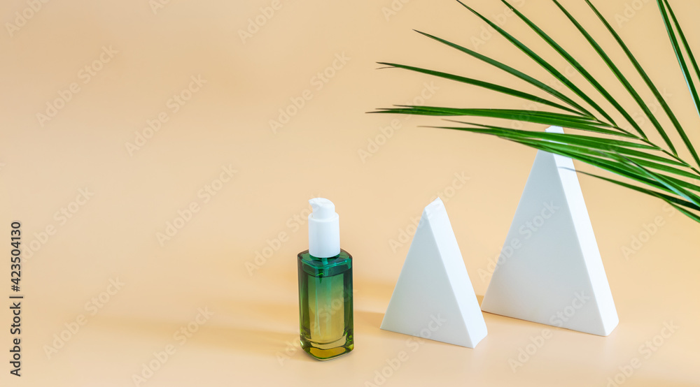 Geometric figures and cosmetic bottle on the beige background with natural palm element. Nice background, podium for displaying your cosmetics or any other product, for your design or text.