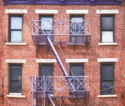 Old red brick building with iron fire escape, New York City, USA.