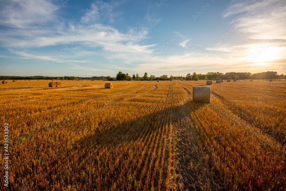 Late summer sunset landscape in wide field after harvesting, straw bales making shadows. Farming, agriculture, countryside concept.