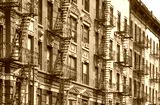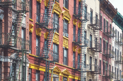 Row of old buildings with iron fire escapes, color toning applied, New York City, USA.