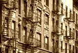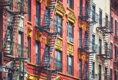 Row of old buildings with iron fire escapes, color toning applied, New York City, USA.