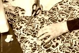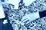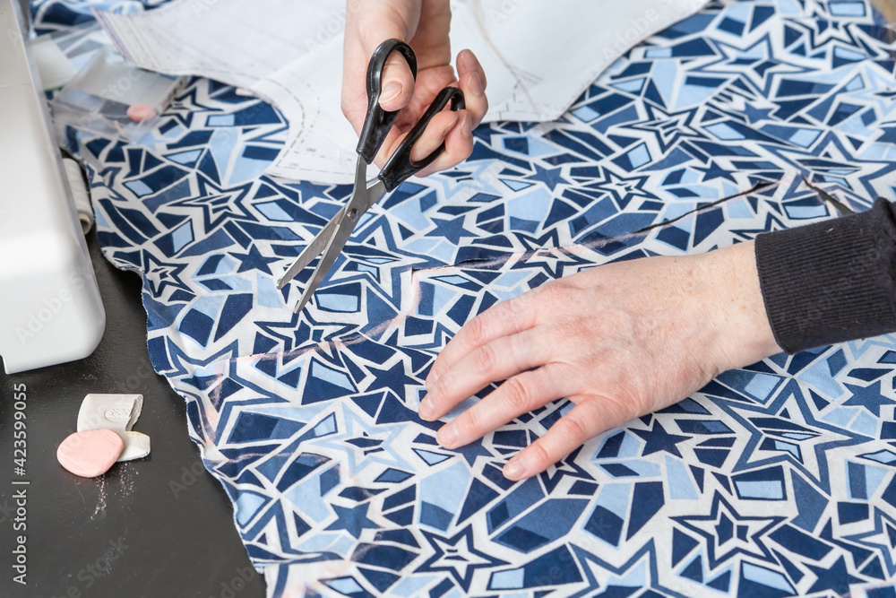 Top view of woman's hands cutting fabric.. Horizontally.