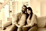 Happy young indian couple real estate buyers hugging sitting on couch at home looking at camera. Smiling husband and wife new homeowners embracing, enjoying own apartment purchase, portrait.