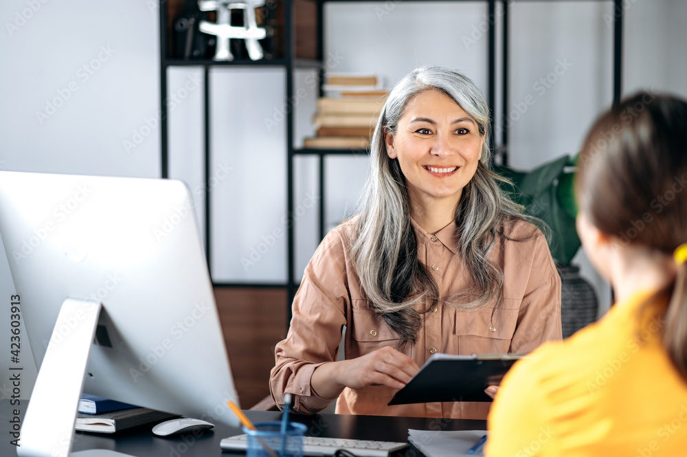Intelligent confident influential gray-haired female asian wearing glasses, business lady, HR manager, talking to job candidate in modern office, holds and studies resume, smiling friendly