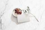 Breakfast, snack still life scene. Blank business card mock-up. Red fresh grapes fruit on ceramic plate and olive tree branch. White marble table in sunlight. Summer Mediterranean flat lay, top view.