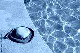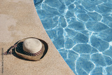 Poolside still life. Straw hat on floor next to resort swimming pool. Glittering crystal clear blue water in sunlight. Summer holiday composition. Swimming, relaxation and travel concept.
