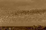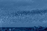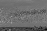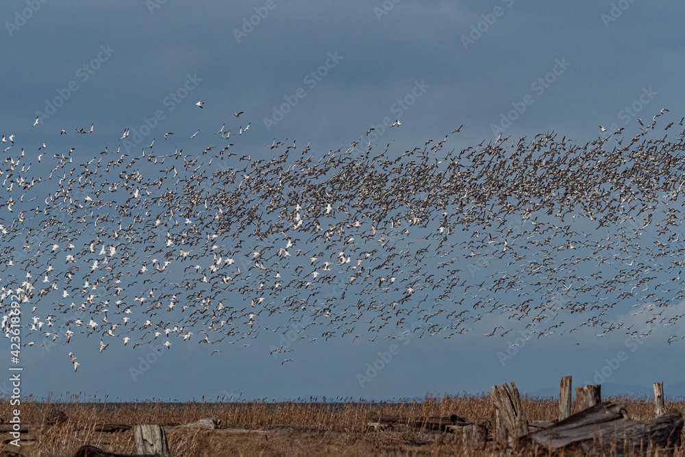 a large flock of snow geese took flight over the edge of brown grasses filled wetland by the coast with clouds above the mountain range over the horizon