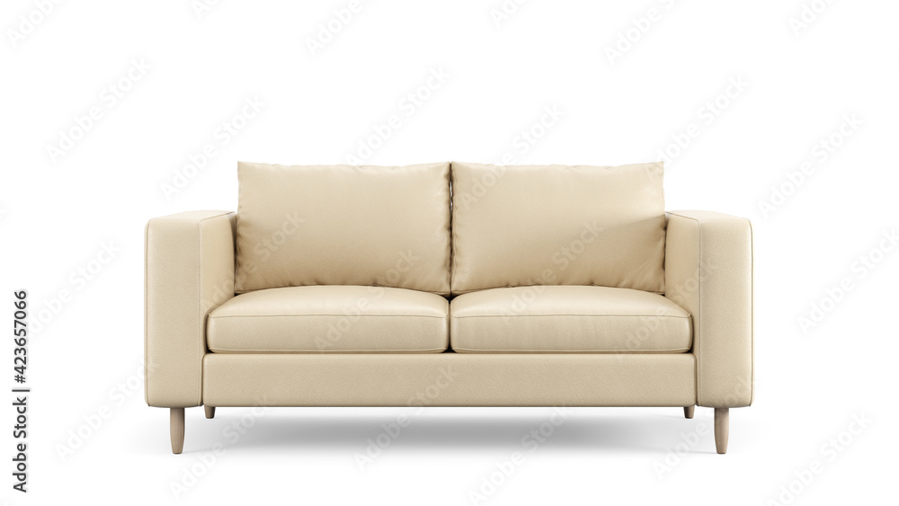 Modern beige leather upholstery sofa on isolated white background. Furniture for modern interior, minimalist design.