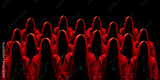 People dressed in a red robes looking like a cult members on a dark background. No face. Occult, sect concept.
