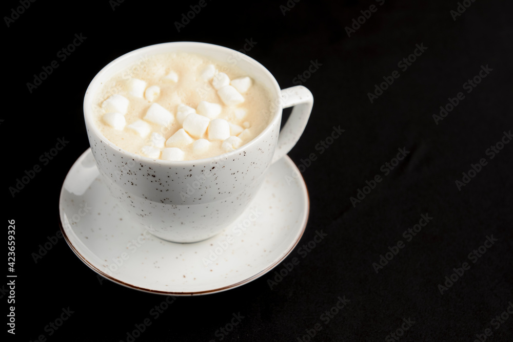 Cup of latte coffee with marshmellows over black background. Coffeee time, isolated on black.