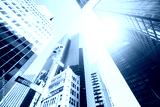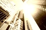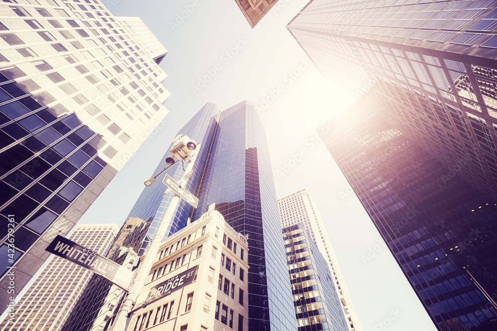 Looking up at New York skyscrapers against the sun, color toned picture, USA.