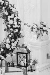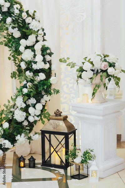 Elements of the wedding decoration and part of made of wedding round arch with white roses and greenery.