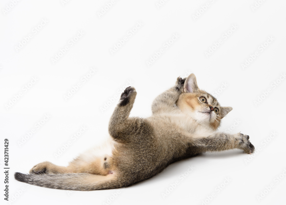 little kitten scottish chinchilla lies on a white background, cute animal plays