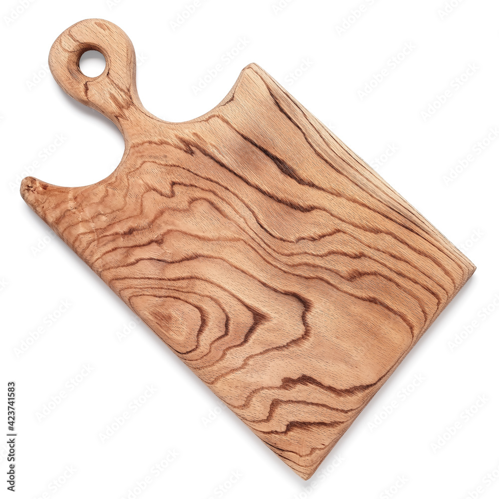Handmade wooden cutting board with textured pattern isolated on white background.
