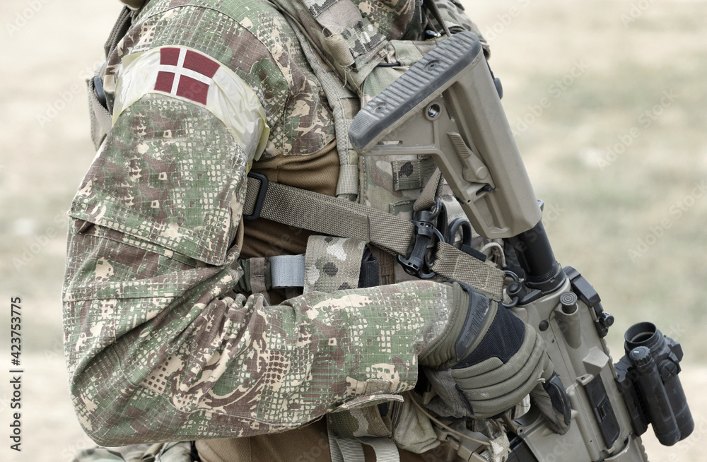 Soldier with assault rifle and flag of Denmark on military uniform. Collage.