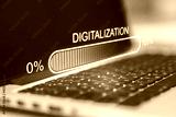 Touch the future concept with virtual sign of digitalization word above laptop keyboard.