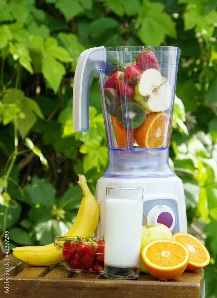 Electric blender with fruits in it