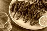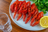 Boiled red crayfish on a plate, a glass beer, fresh herbs and lemon.Concept:beer appetizer, delicacy, crayfish meat.