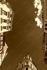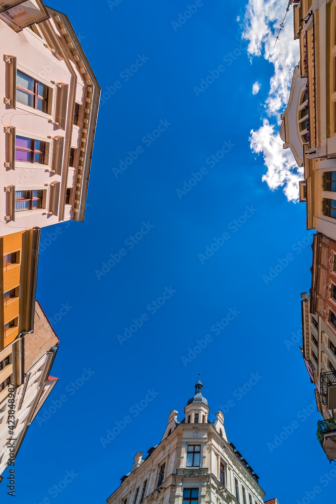 Low angle shot of colorful old tenement buildings in Torun, Poland