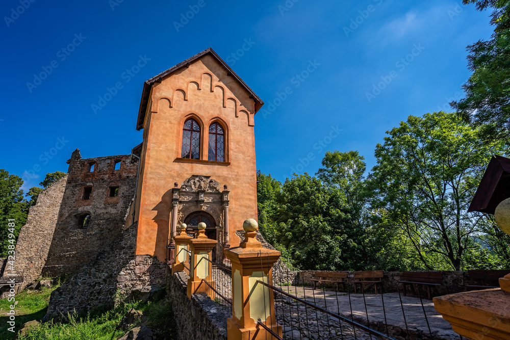 Grodno Castle surrounded by greenery under the sunlight and a blue sky in Zagorze, Poland