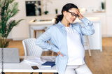 Upset emaciated stressful pregnant mixed race woman wearing glasses, business lady or office employee, stands near workplace, taking break due headache and fatigue, holding her head with her hand
