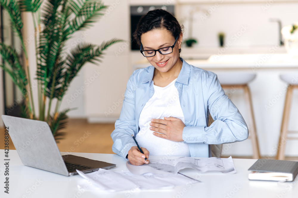 Female pregnant employee. Attractive successful pregnant mixed race lady, designer or top manager, works at home remotely, taking notes and checking the business project, stroking her belly, smiling