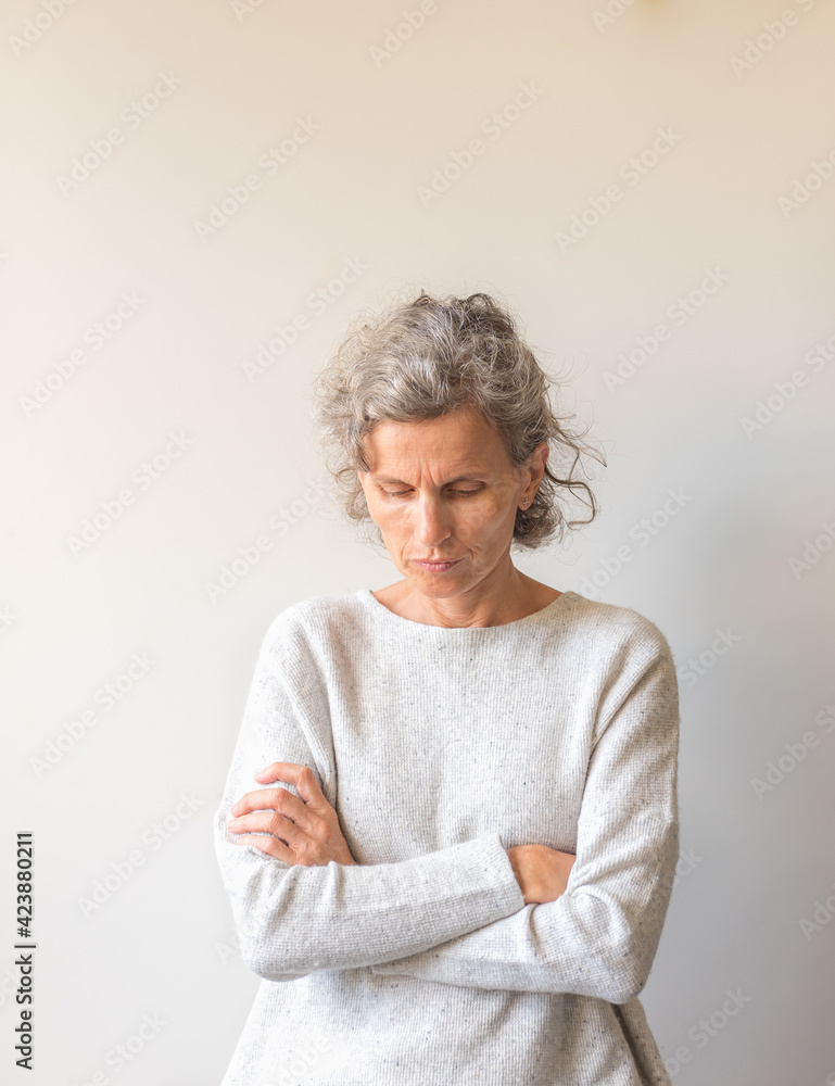 Waist up view of natural middle aged woman looking down with crossed arms against neutral wall background (selective focus)