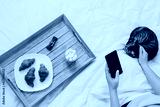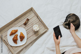 Woman's hands are holding a smartphone in bed and pet the cat. Top view of breakfast in bed.