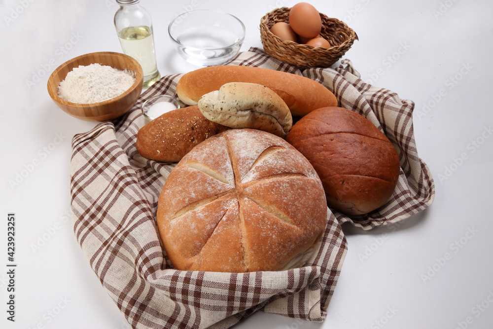 Freshly baked bread loaf bun roll round long mix verity wrapped in checkered kitchen fabric napkin towel wheat flower oil water salt eggs over white background